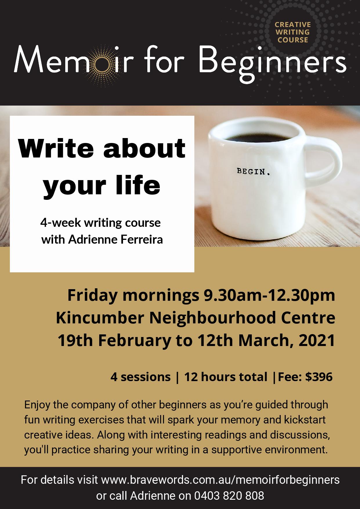 Writing instructor Adrienne Ferreira is passionate about sharing her knowledge and empowering others. By facilitating informed conversations about the creative process, Adrienne’s strategies are designed to give new writers the tools to overcome self-doubt and keep writing. Any questions call Adrienne on 0403 820 808.